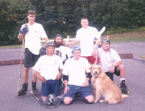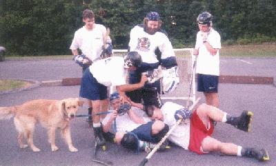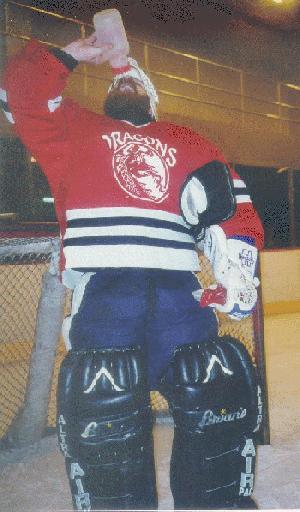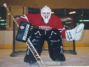 a picture of me in goal for my NHL (Nittany Hockey League) team the Dragons.